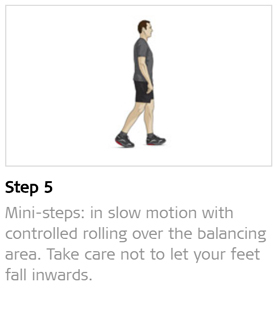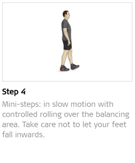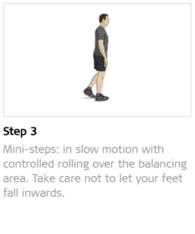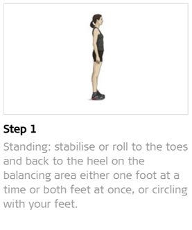 Make standing a useful daily exercise by stabilising or rolling forward to the toes and back to the heel on the balancing area, either one foot at a time or both feet at once, or circling with your feet. You can take mini-steps in slow motion with controlled rolling over the balancing area and take care not to let your feet fall inwards. Also walk slowly backwards in between. Purpose: train intra- and intermuscular coordination and stand stability.